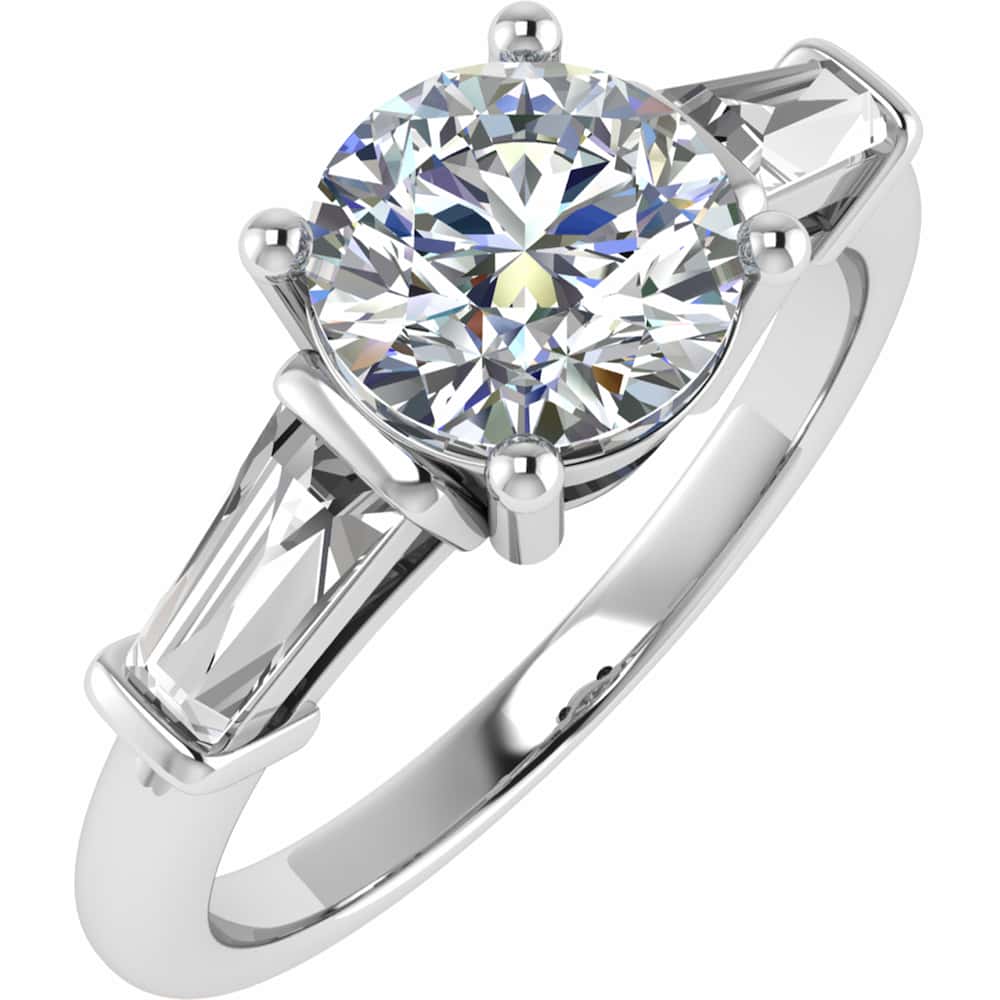 This refined three-stone engagement ring features a GIA-certified natural round brilliant diamond at its centre, complemented by two tapered baguette side stones. Graded F–G for colour and VS1–VS2 for clarity, the diamonds offer impressive brilliance with minimal inclusions and a near-colourless finish. The round centre stone provides timeless sparkle, while the baguette accents add a sleek, modern touch. Set in a polished band, this design symbolises the past, present, and future—making it a meaningful and enduring choice for a lifelong commitment.